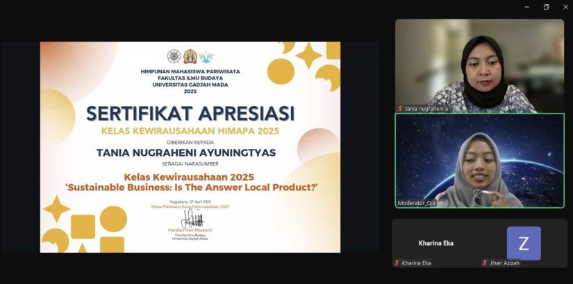 Himpunan Mahasiswa Program Studi Pariwisata (HIMAPA), UGM kembali menggelar Kelas Kewirausahaan 2025 dengan tema “Sustainability Business: Is The Answer Local Product?” pada Minggu, 27 April 2025, pukul 10.00–11.30 WIB secara daring melalui Zoom Meeting. Kegiatan ini menjadi ruang belajar bagi mahasiswa dan pelaku usaha untuk memahami strategi pengembangan produk lokal dalam kerangka bisnis berkelanjutan.